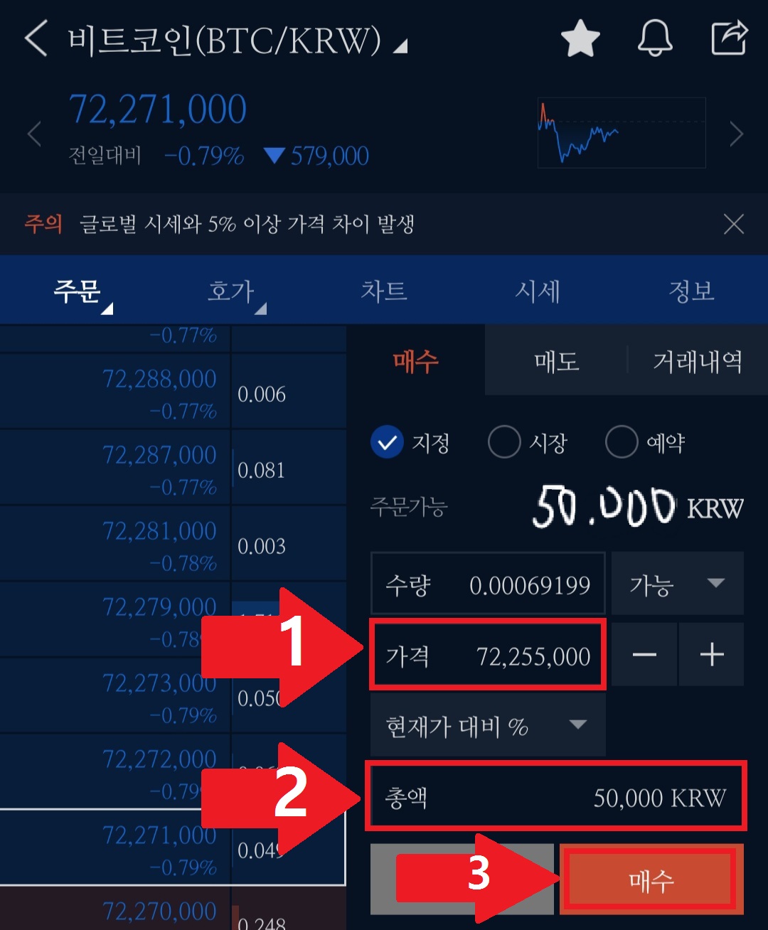 ① 비트코인을 구매하고 싶은 가격대를 정하고,