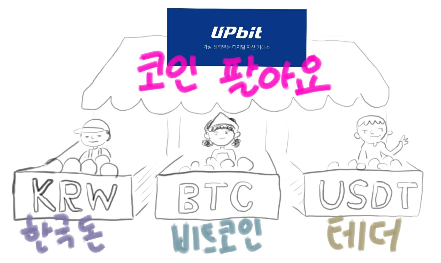 다시 말해 '업비트'라고 하는 가게는 3개로 나누어져 있는데, 한 곳에서는 한국돈만 받고 코인을 팔고, 다른 한 곳에서는 비트코인만 받고 코인을 팔며, 남은 한 곳에서는 테더만 받고 코인을 판다고 보면 되겠습니다.