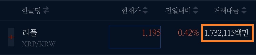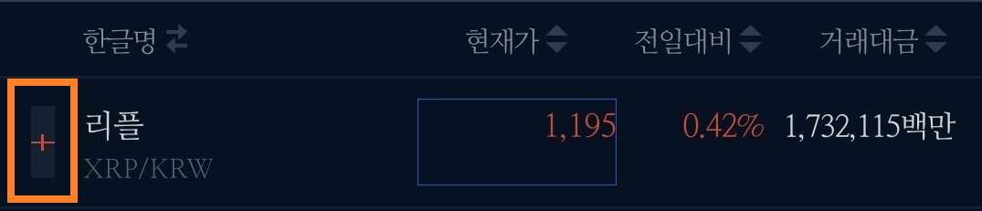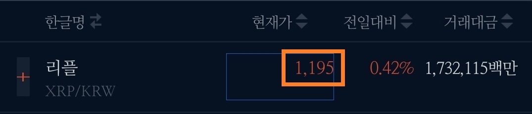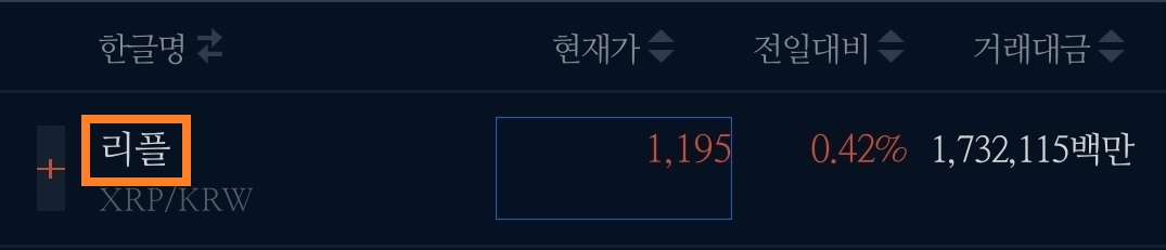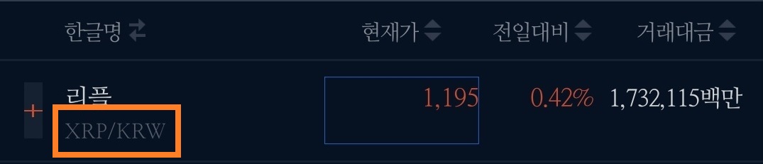 그럼 이제 거래소 내의 표를 하나씩 살펴봅시다. '리플'을 예로 들어 보겠습니다.