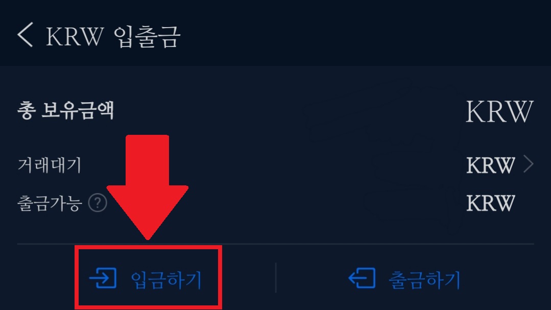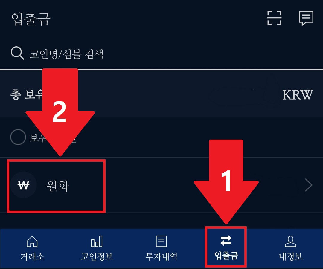 '입출금'을 선택하고 '원화'를 누릅니다. 만약 원화가 보이지 않는다면, 위의 '코인명/심볼 검색'에서 '원화'를 입력해서 찾을 수 있습니다.