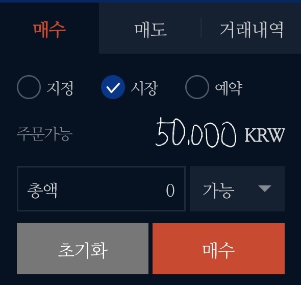 시장가는 비트코인 시세대로 구매하는 것입니다. 어떤 가격이든지 현 시세에 맞게 빠르게 구매하고 싶다면 시장가를 이용합니다. 구매하고 싶은 액수만 적어서 '매수'버튼을 누르면 됩니다.