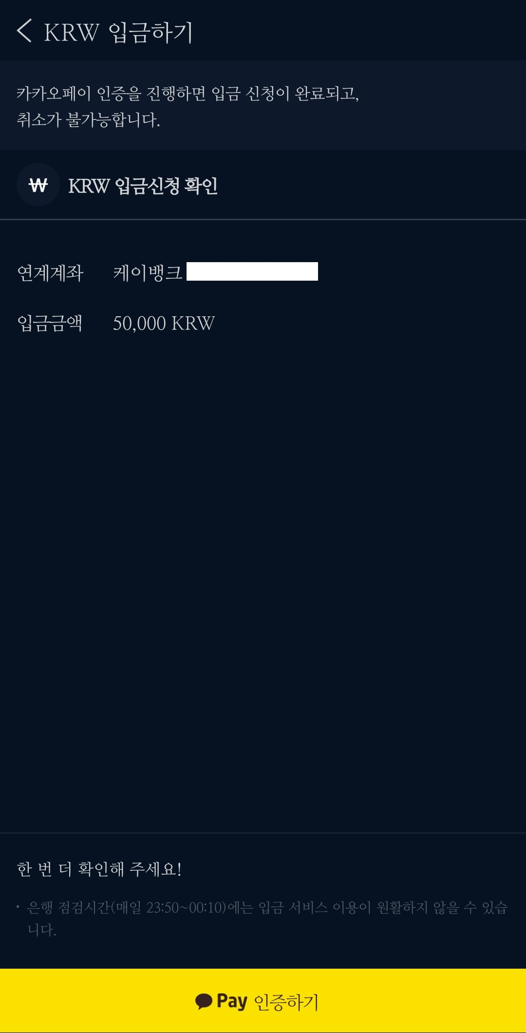 케이뱅크 계좌에 비트코인을 살 금액을 넣어 놓습니다. 예시로 5만 원만 넣어 보았습니다.