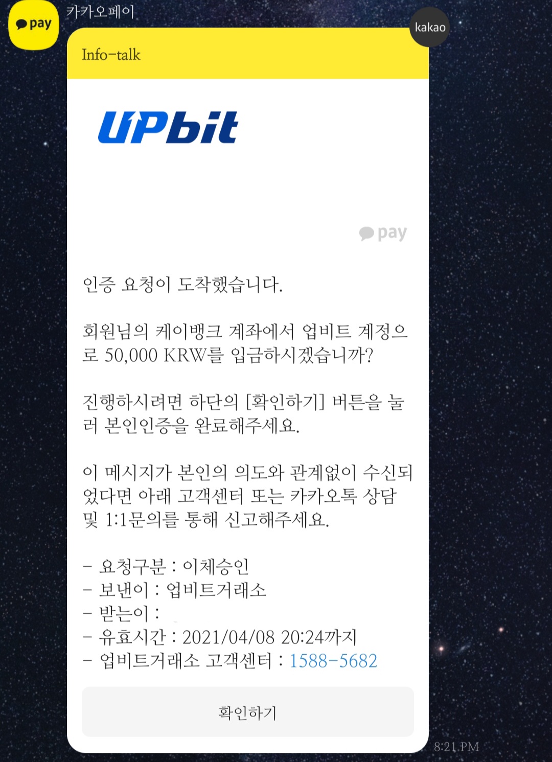 그러면 카카오톡으로 인증하는 메시지가 옵니다. 인증을 완료합니다.