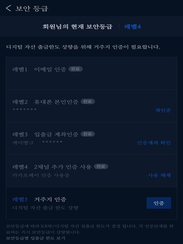 레벨 1부터 4까지 차례대로 인증합니다. 5단계 인증은 현재 중단된 상태입니다. 4단계까지만 해도 거래하는 데는 문제가 없습니다.