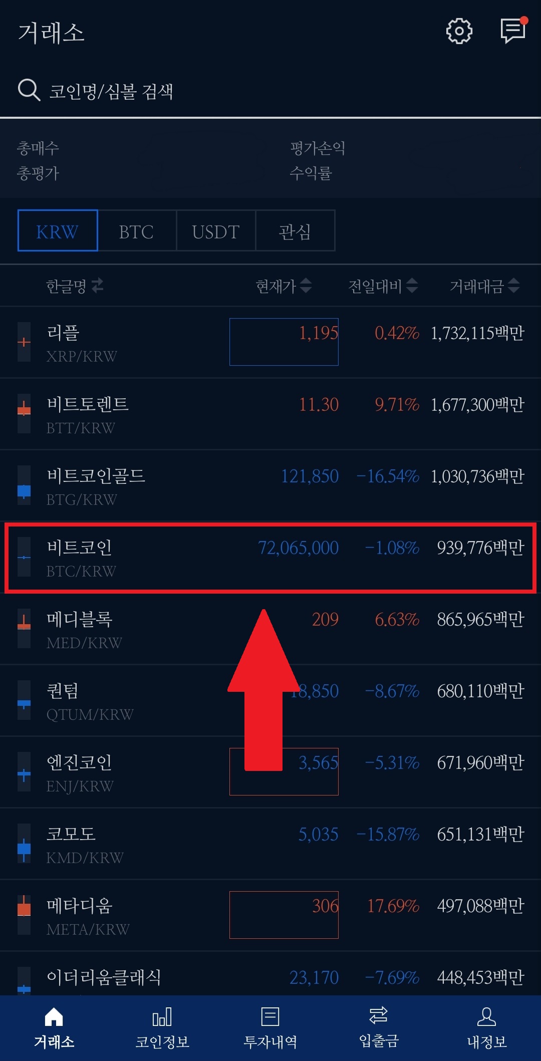 업비트 거래소 화면에는 업비트에서 취급하는 코인이 있습니다.