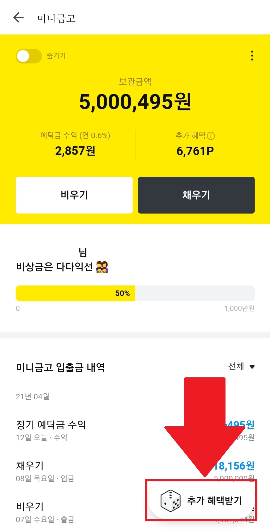 카카오페이 미니 금고에 여유자금을 보관하고 매주 이자를 받을 수 있습니다. 카카오페이 앱을 사용하는 경우에는 '주사위 굴리기'를 통해 포인트를 더 쌓을 수 있습니다.