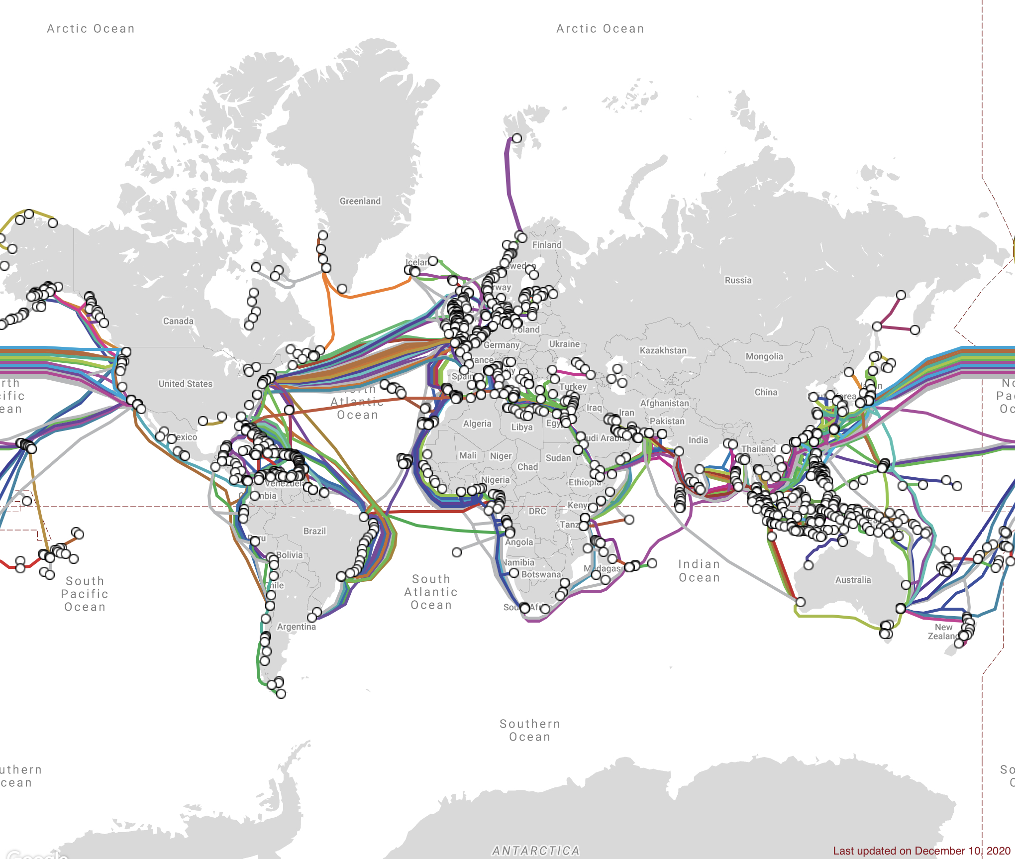 1번과 2번 모두 정답이 될 수 있습니다. 처음 인터넷이 도입되었을 때, 통신의 기반은 대부분 유선(케이블)이었습니다. 다른 나라끼리 케이블을 연결해야만 서로 통신할 수 있었던 것입니다. 현재도 상당한 데이터가 케이블을 통해서 전달됩니다. 그렇다면 여기서 의문점이 생길 수 있습니다. 우리나라와 미국의 경우, 거리가 아주 먼 데다가 땅이 맞닿아 있지도 않은데 어떻게 케이블이 연결되어 있다는 말일까요? 아래의 지도를 봅시다.