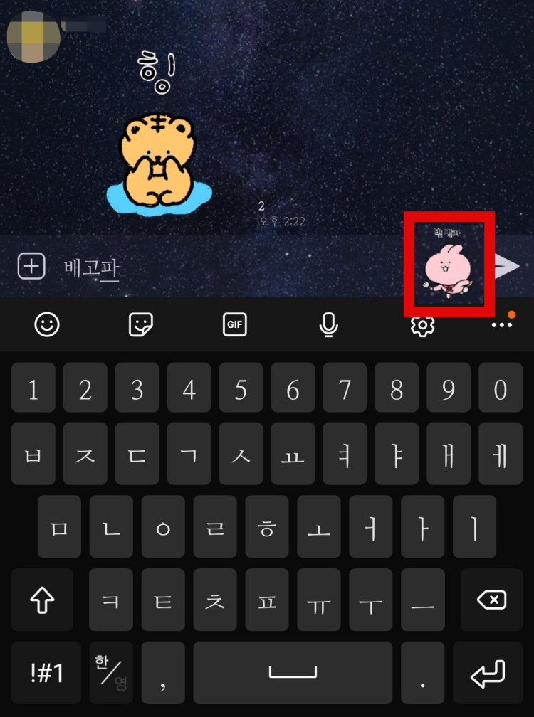 채팅창에 글을 입력할 때 추천 이모티콘이 자동으로 뜹니다. 예를 들어서, '배고파'라고 썼을 때 입력칸 오른쪽의 작은 그림을 누르면 관련 이모티콘들이 나타납니다.